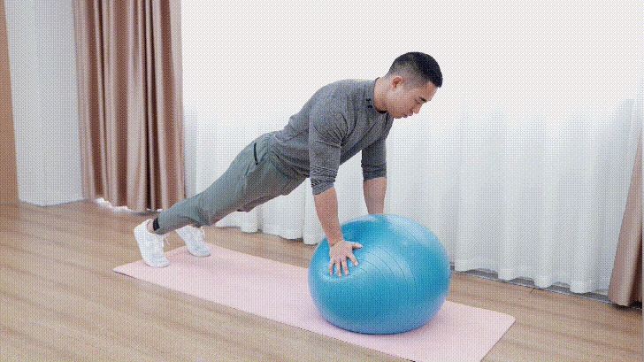 将两手与肩同宽置于健身球上,两脚撑地,头自然平视;脊柱保持一条直线,保持均匀的呼吸,不要憋气。