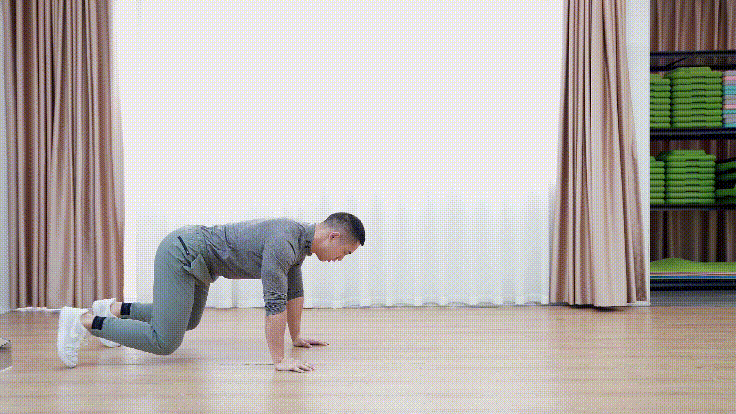 双手双脚撑于地面,膝盖离地面10cm左右。前进时以对侧边手脚作移动(右手左脚一起动),保持脊柱与骨盆中立位,微收下巴,核心收紧。