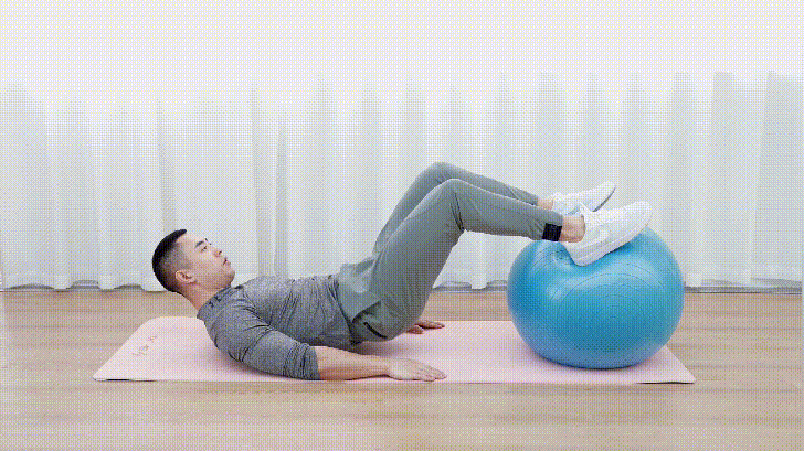 起始时,双脚放于健身球上,身体平躺于地面,双手展开放于地面,掌心朝下,眼睛看天花板,保持躯干部分平躺于地面。挺髋时,膝盖不能弯曲且不出现身体的翻转。当髋关节完全伸展时,屈膝勾腿,核心区保持积极状态,并激活后侧链肌群。