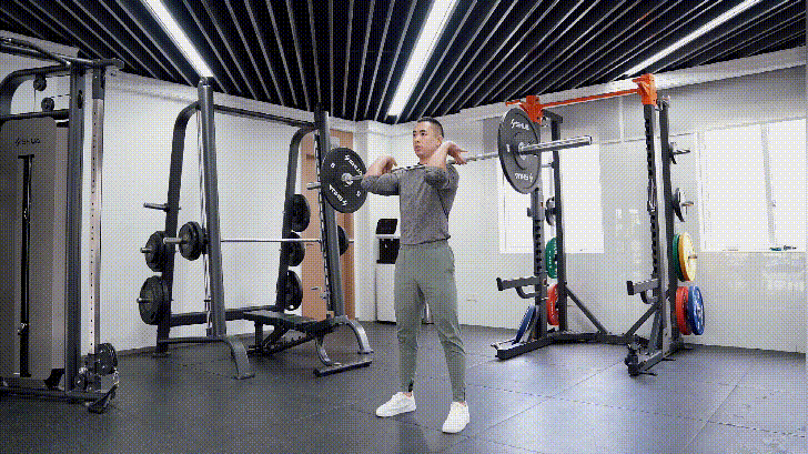 将杠铃杆放在肩膀前面,在保持直立姿势的同时,慢慢弯曲膝盖。向下,直到你的膝关节弯曲约90度。再慢慢起身,将双腿拉直到起始位置。