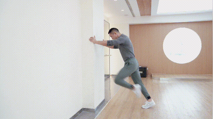双手托在墙上,上身向前倾斜,一边快速抬起膝盖,对侧脚向下发力蹬地,进行提膝动作。